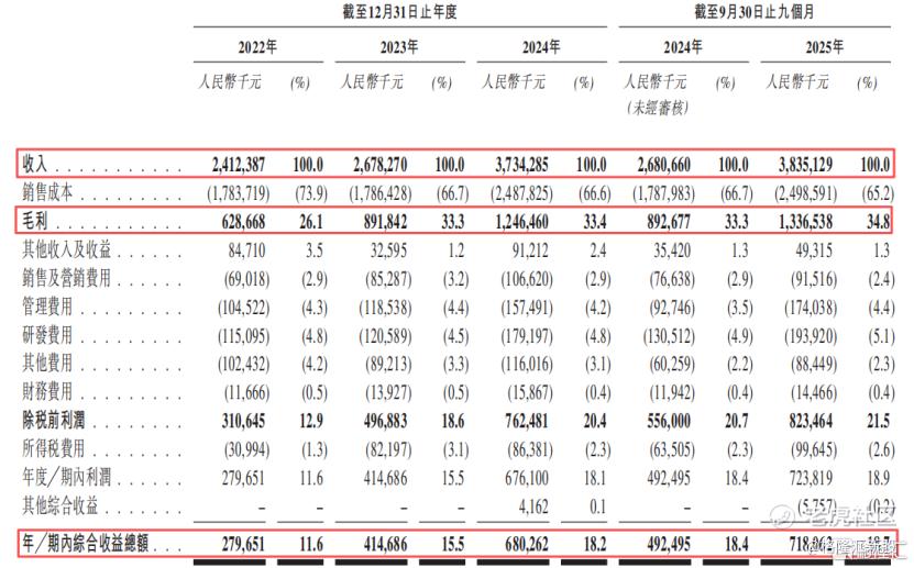 2022年、2023年、2024年及2025年1-10月(报告期),公司的收入分别为24.12亿元、26.78亿元、37.34亿元、38.35亿元,净利润分别为2.8亿元、4.15亿元、6.76亿元、7.24亿元。