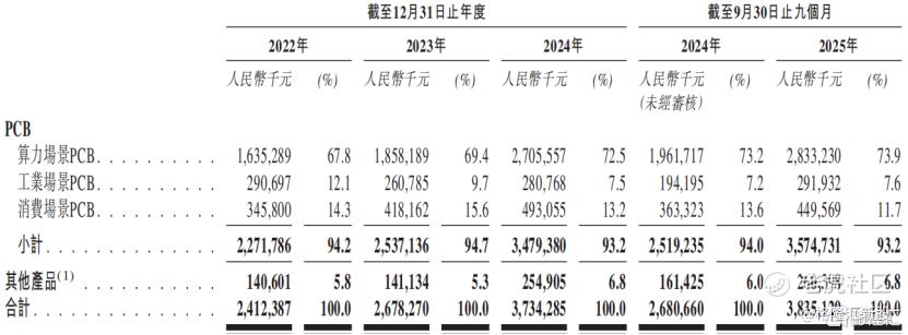 2022年、2023年、2024年及2025年1-9月(报告期),公司来自算力场景PCB的收入分别为16.35亿元、18.58亿元、27.06亿元、28.33亿元,占同期总收入的比重在70%左右。