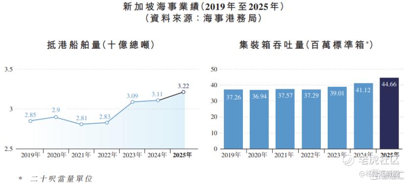 2019年至2025年期间,尽管全球贸易环境出现短期波动,新加坡仍维持稳定的船舶流量与集装箱吞吐量,2025年船舶到港总吨位约32.2亿总吨,集装箱吞吐量约4466万标准箱,均创历史新高。