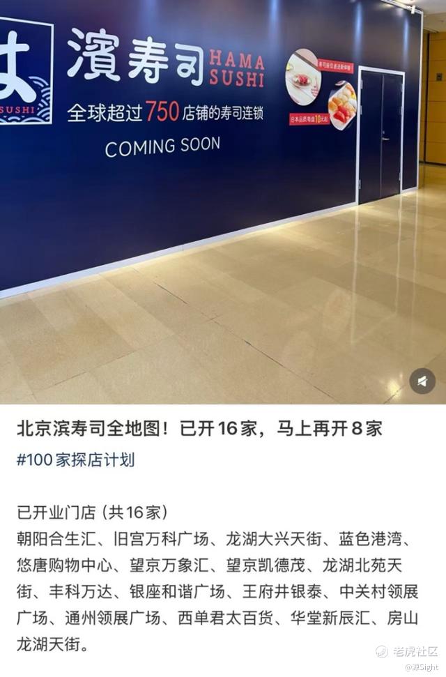 有消费者表示,目前滨寿司在北京的开店速度明显加快,其已在当地开设有16家门店,马上将新开8家门店。其中,三里屯、京西大悦城、惠多港购物中心、密云万象汇等商圈,都将出现滨寿司的身影。