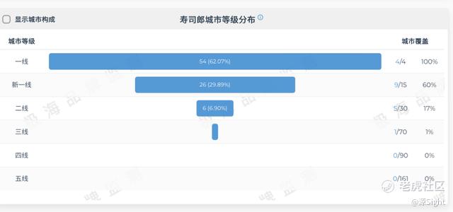 但同时,寿司郎、滨寿司的城市布局同样高度集中,其中寿司郎有超过90%的门店位于一线和新一线城市;滨寿司一二线城市的门店占比也与前者接近。