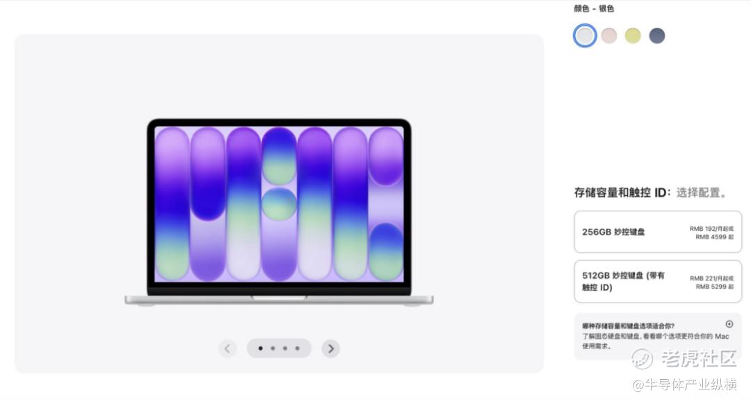 屏幕与机身方面,采用13英寸Liquid视网膜显示屏,支持10亿色彩、500尼特亮度,画质表现远超同价位Windows本;机身采用再生铝金属打造,重量仅1.2kg左右,轻薄易便携,同时推出银色、桃粉色、柑橘黄色、靛蓝色四款多彩配色,贴合年轻用户审美。