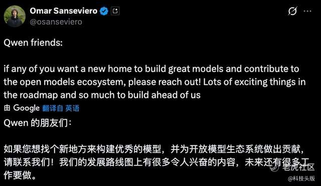 谷歌DeepMind开发体验负责人Omar Sanseviero抓住了这个机会,突然在社交平台上公开喊话:“千问的朋友们,如果想找个新地方来打造优秀模型,并为开源模型生态系统做出贡献,请随时联系我!我们的路线图中有很多令人兴奋的事情。”