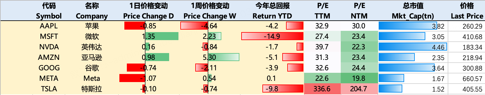 本周市场表现分化,大科技股涨跌互现。截止3月5日收盘,过去一周 $苹果(AAPL)$ -4.64%, $微软(MSFT)$ 2.23%, $英伟达(NVDA)$ -0.84%, $亚马逊(AMZN)$ 5.3%, $谷歌(GOOG)$ -2.11%, $Meta Platforms, Inc.(META)$ 0.54%, $特斯拉(TSLA)$ -0.74%.
