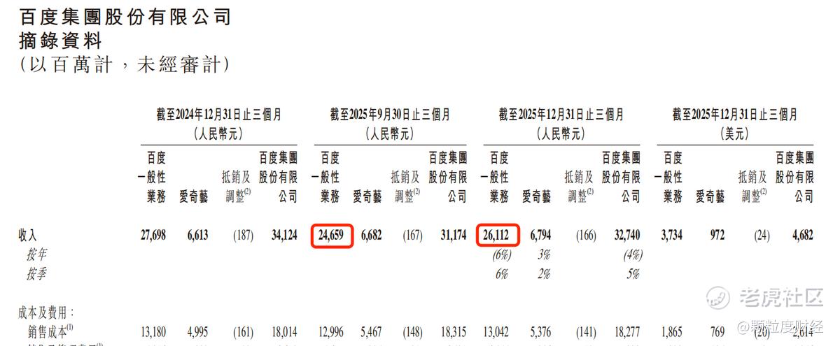 不过可喜的一点是,如果只看季度间变化,百度一般性业务收入从2025年Q3的246.59亿增长到了2025Q4的261.12亿。