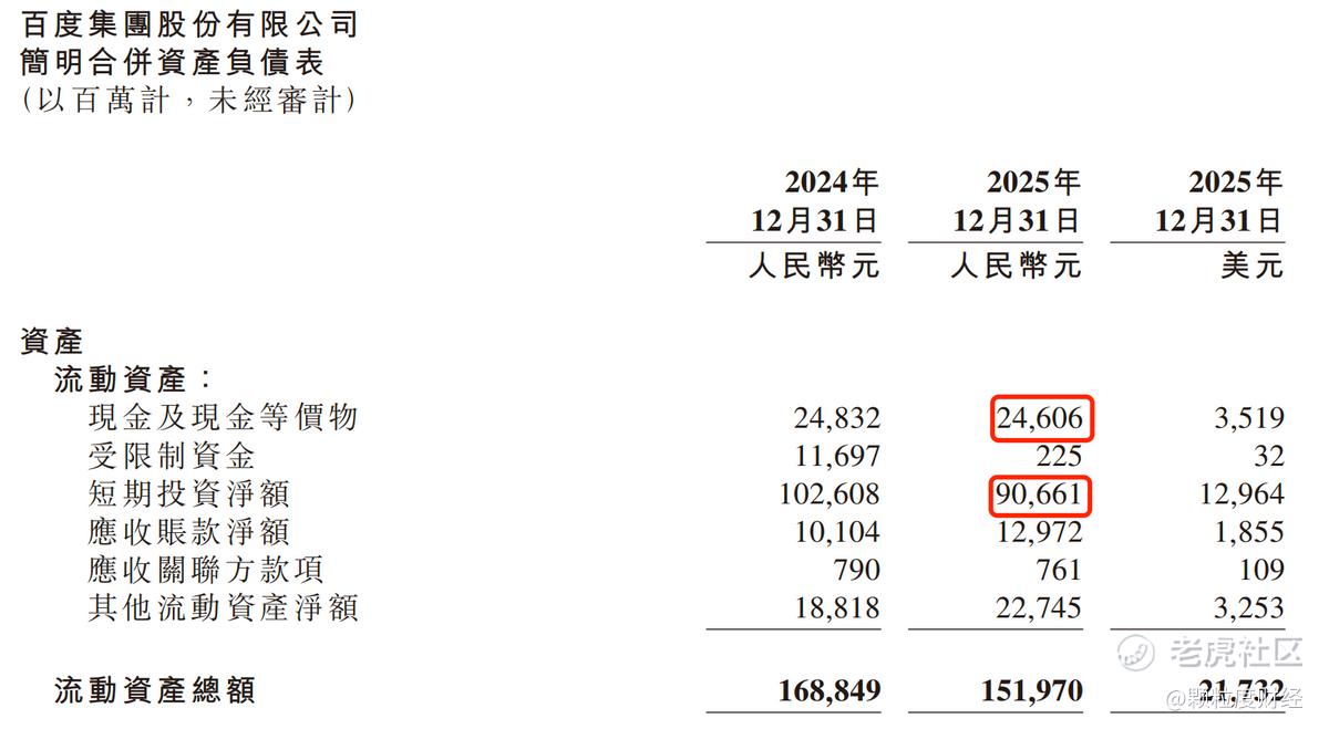 截至2025年12月31日,百度持有现金及现金等价物246.06亿元,短期投资净额906.61亿元。