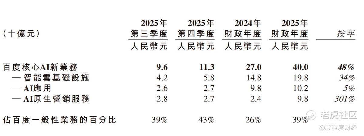 第一次披露AI收入占比。2025年,百度AI业务营收达400亿元,同比增长48%。四季度,百度总营收327亿元,AI业务收入占百度一般性业务收入的43%。