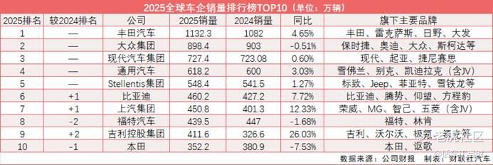 2025年全球车企销量排行最终尘埃落定。丰田、大众、现代汽车、通用汽车依旧占据前四不变,Stellantis集团以逾540万辆的销量继续位居全球第五。值得注意的是中国车企占了三个位置:比亚迪、上汽集团和吉利控股分别拿下第六、第七、第九。