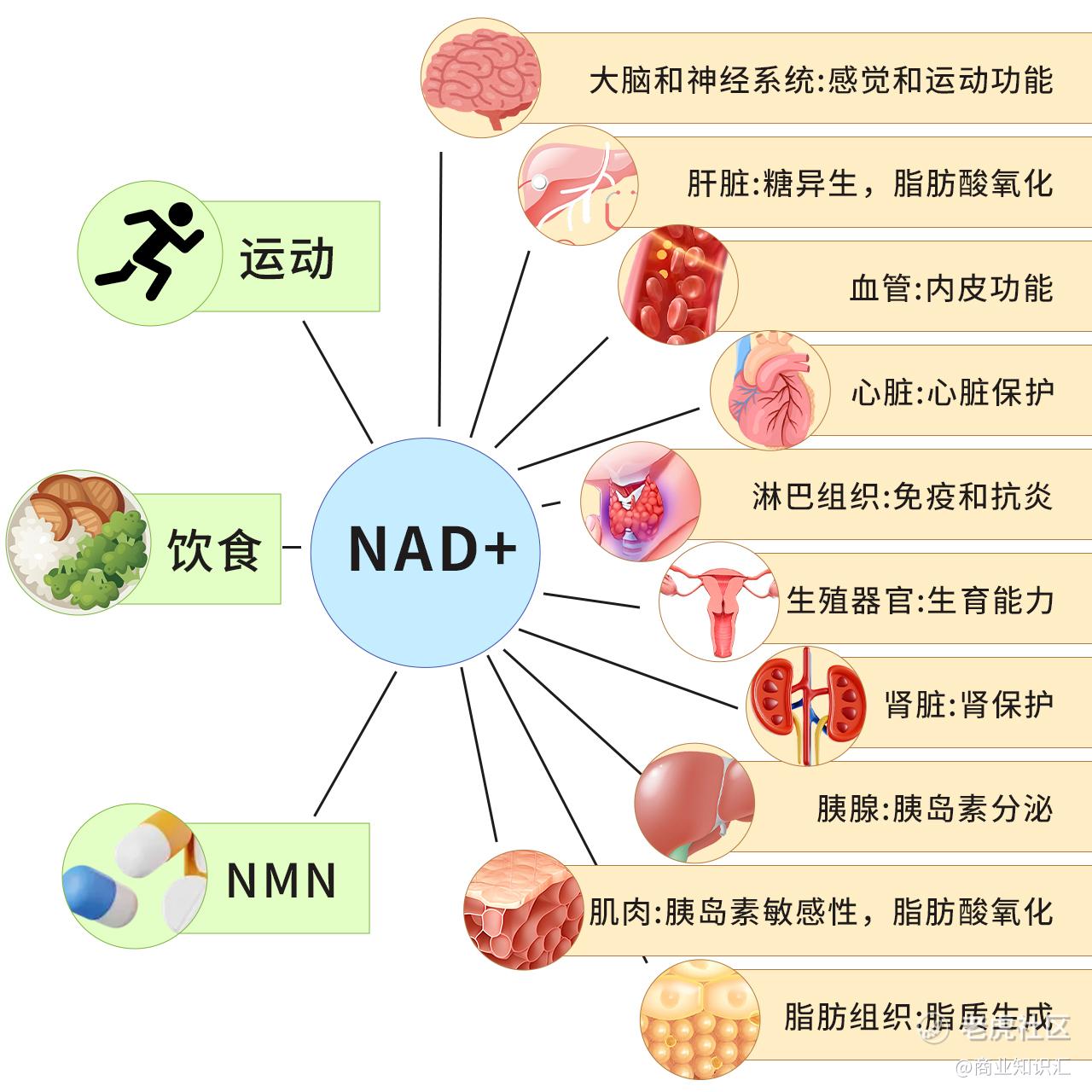 NMN的作用机制是通过提升体内NAD+水平来实现的,其功效广泛且显著: