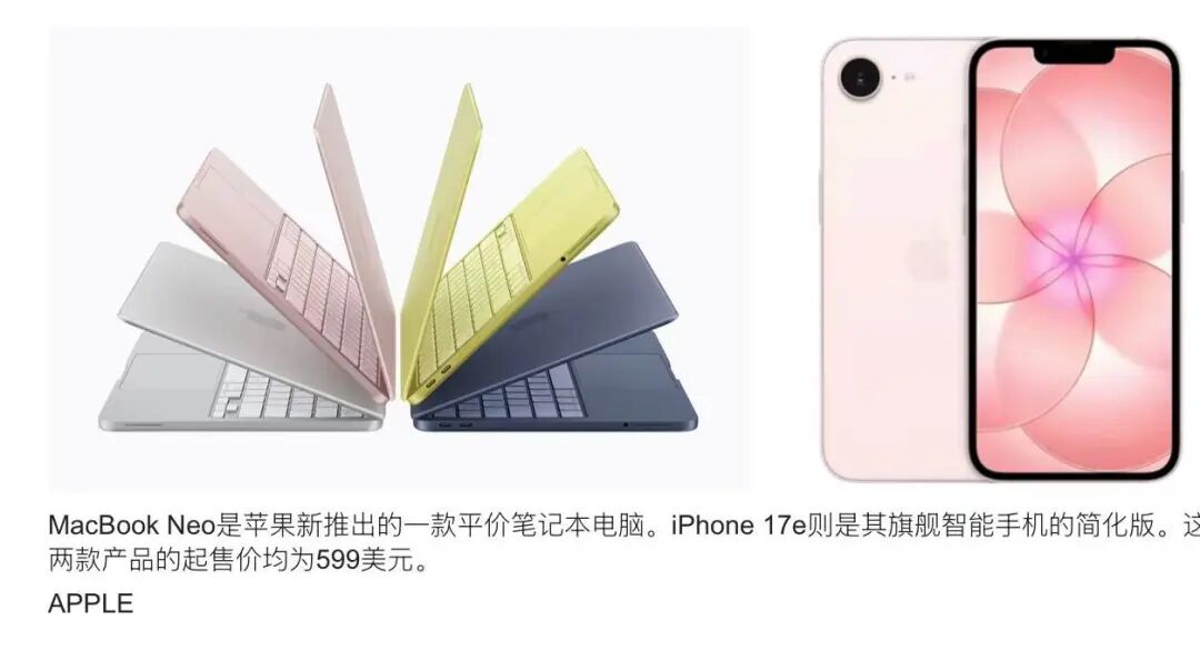 MacBook Neo是苹果新推出的一款平价笔记本电脑。iPhone 17e则是其旗舰智能手机的简化版。这两款产品的起售价均为599美元。