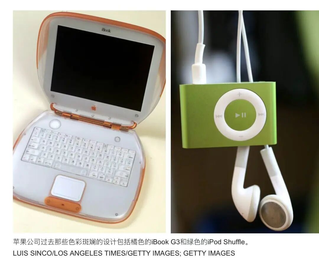苹果公司过去那些色彩斑斓的设计包括橘色的iBook G3和绿色的iPod Shuffle。