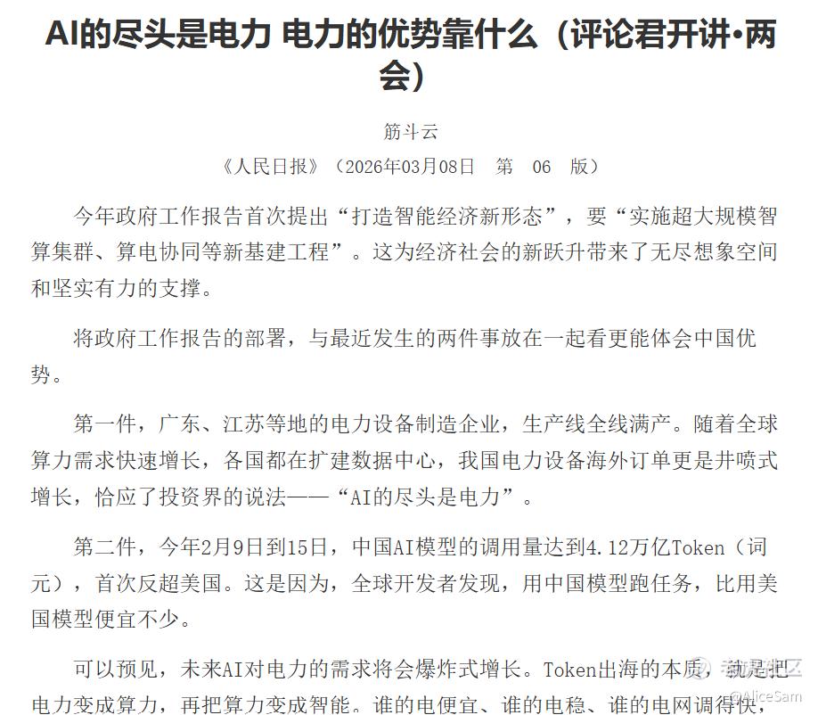 最新的两会特刊,3月8日新鲜出炉的这份,大家都看了吗?这份报告直接点明了,未来AI对电力的需求将会爆炸式增长,AI的尽头是电力!
