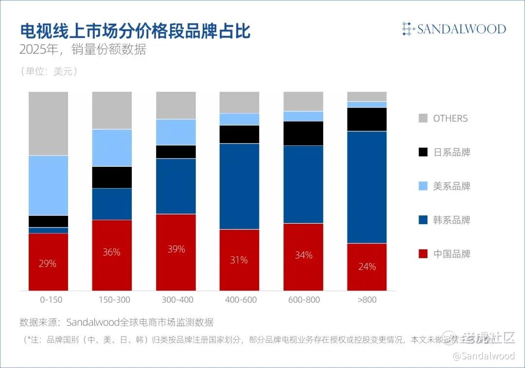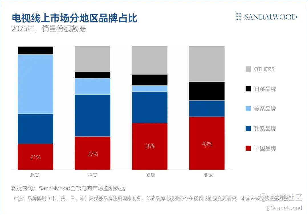 与线下市场趋稳形成对比的是,电商渠道仍展现出较强韧性。根据Sandalwood全球电商监测数据显示,2025年海外电商电视市场同比增长19%,其中中国品牌同比增长27%,在行业整体成熟的背景下仍保持双位数扩张。