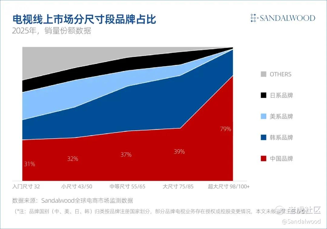 总体而言,中国品牌在中等、大尺寸及超大尺寸区间形成结构性优势,尤其在超大尺寸段持续领先。