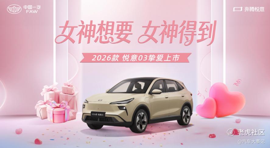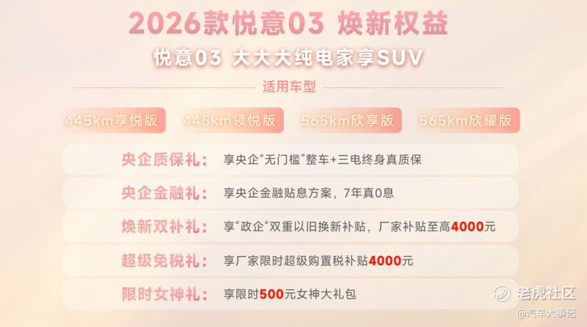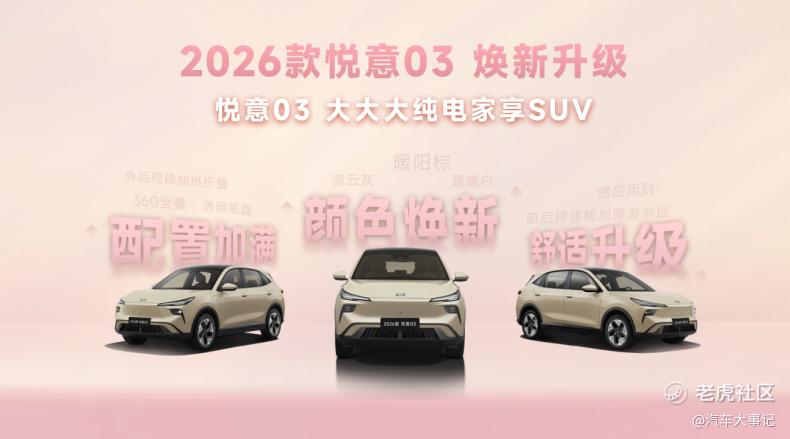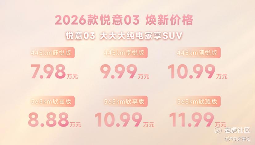 3月8日妇女节,“大大大纯电家享SUV”焕新而来,2026款悦意03挚爱上市,445km、565km两种续航共计6款车型,官方售价7.98-11.99万元。