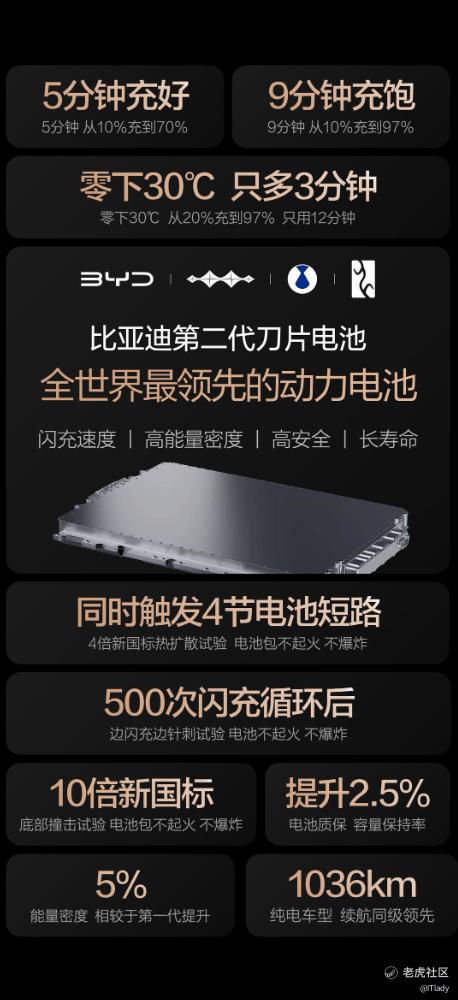 3月5日,比亚迪重磅发布第二代刀片电池,实现“常温充电,5分钟充好,9分钟充饱;低温充电,零下30度,只多3分钟”,以“闪充、高能量密度、长寿命、高安全”全能表现,重新定义全球领先动力电池,一举攻克“充电慢”“低温充电难”的行业痛点。比亚迪第二代刀片电池,用实力说话,闪充不仅快,而且更耐用、更安全。