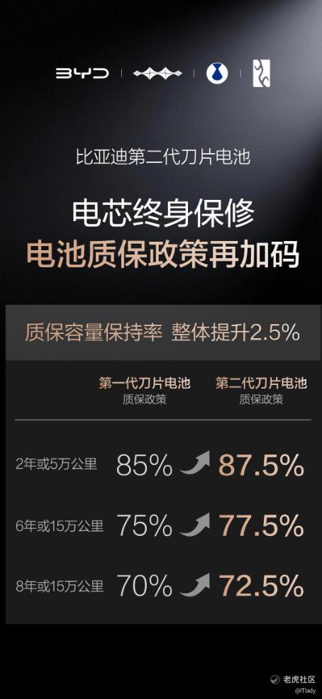 闪充不影响电池寿命,而且比亚迪第二代刀片电池,相比第一代刀片电池,寿命更长。因为对第二代刀片电池有足够的信心底气,比亚迪宣布电池质保政策再加码!第二代刀片电池质保的“容量保持率”整体提升2.5%,电池容量低于77.5%就免费包换,电芯依旧是“终身保修”。第二代刀片电池用实力说话,给所有用户安心承诺!