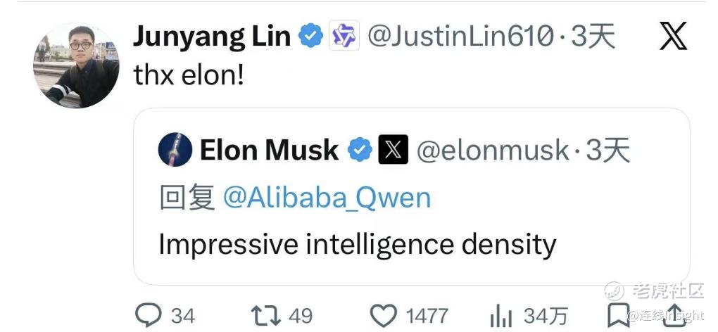 就在这条推文发布的前一天晚上,Qwen团队刚刚推出了Qwen 3.5轻量化模型。该模型发布后,埃隆·马斯克称赞其具有“impressive intelligence density”,林俊旸随后回复并与之友好互动。