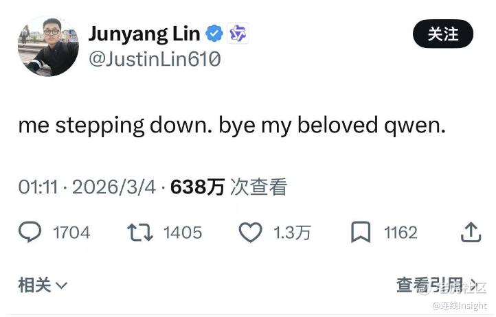 2026年3月4日凌晨,林俊旸在X平台上敲下的这句告别,像一颗石子投入本就暗流涌动的湖面。