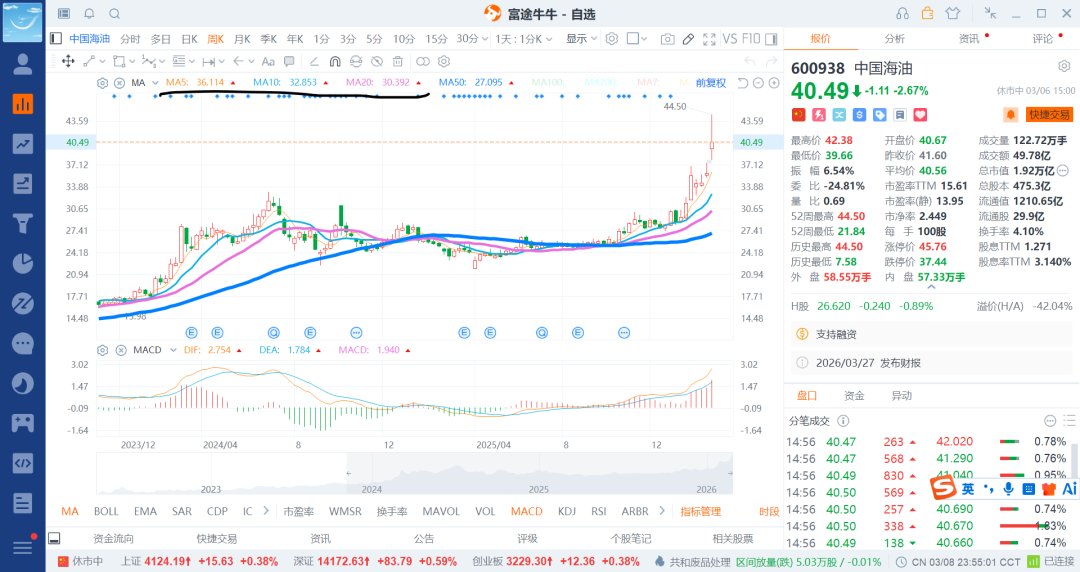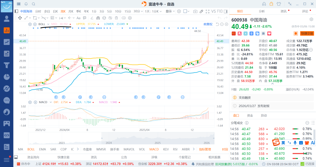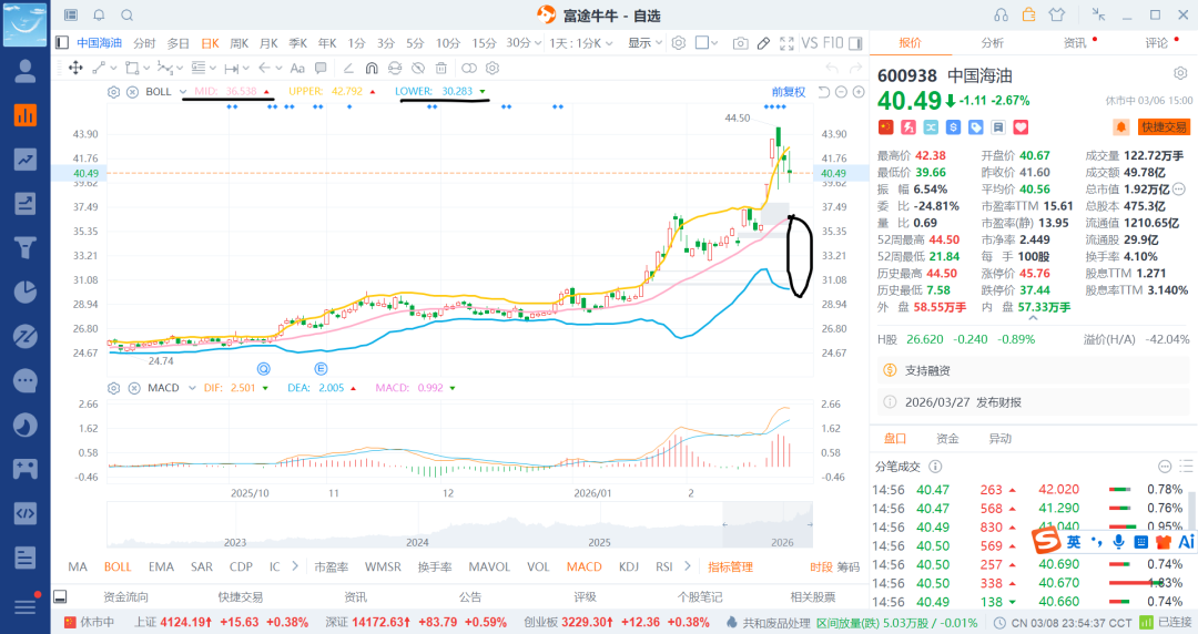 后续依旧是低吸,不给机会就算了,涨到50多就是a股市值第一了,除非到时候原油持续横盘在120/150以上不然难度就很大了,也会持续的震荡,要是外盘原油跌了,还会杀会33/38附近了,至于很不利30也不好说了,到时候再看吧。