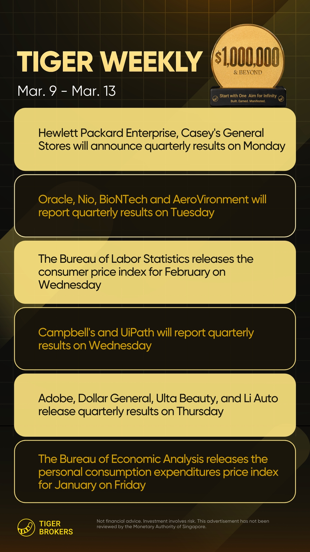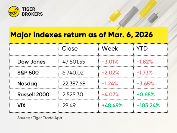 • 负面催化剂:受中东冲突、油价上涨以及令人失望的月度就业报告拖累,美股指数连续第二周下跌。 $道琼斯(.DJI)$ 2.9%, $标普500(.SPX)$ 回落2.0%, $纳斯达克(.IXIC)$ 收跌1.2%