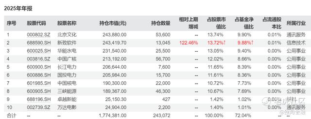 格林新兴产业混合重仓的个股中,与2025年三季度末相比,四季度末仅华致软件连续持有两个季度,其他9只均为新买入的股票。其中,北京文化、华致软件、华能水电3只股票持仓数量占基金净值比均超过9%,中国广核、长江电力、国投电力重仓比例均超过8%,中国核电、三峡能源占持仓占比超过7%、卓越新能、万达电影持仓比例超过1%。2026年一季度重仓的股票将发生哪些变化,独角金融将持续关注。