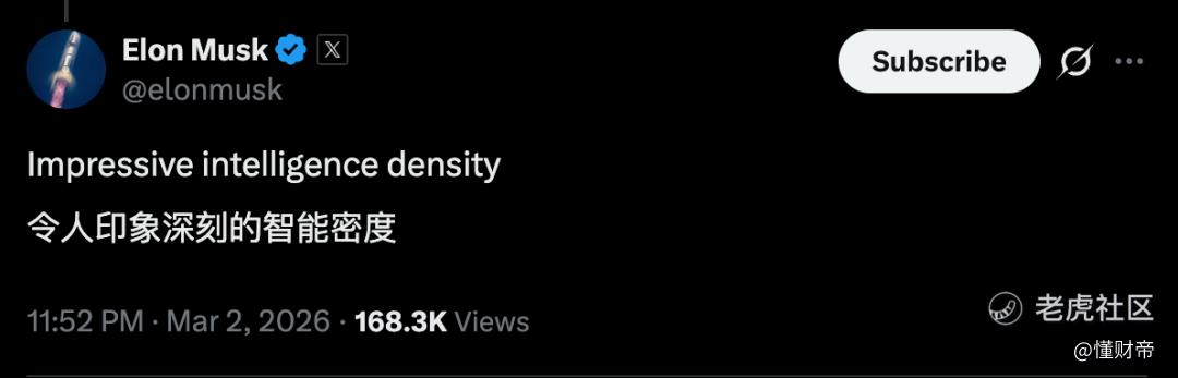 今年3月初,Qwen3.5系列的小尺寸模型开源发布后,马斯克迅速点赞,并表示:Impressive intelligence density(智能密度令人印象深刻)。