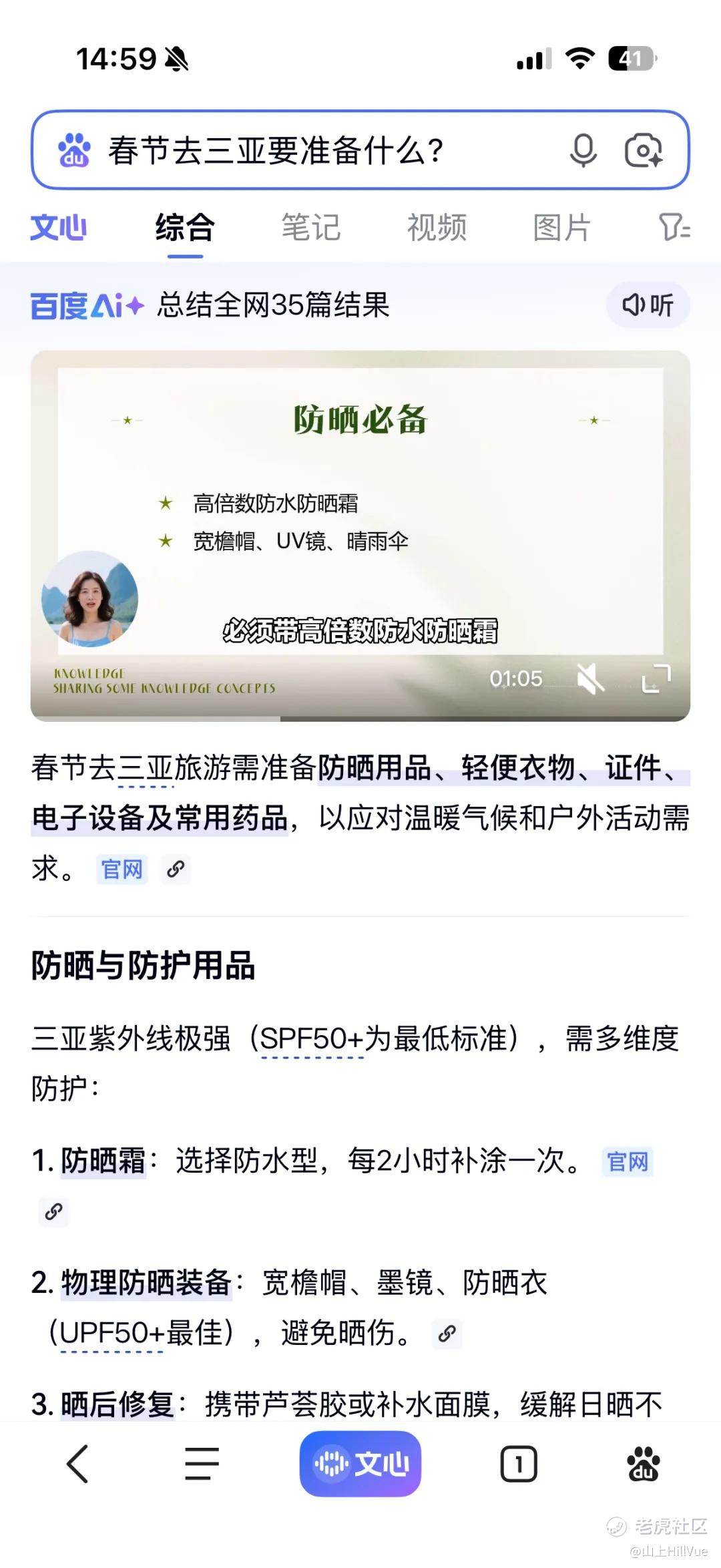 现在你在百度 App 内提问,比如“春节去三亚要准备什么”,顶部直接就呈现百度 AI 助手生成的富媒体答案,点击可在文心内继续追问行程细则、酒店推荐。