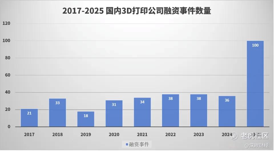 南极熊数据统计,2025年有81家3D打印公司合计获得了100笔融资,数量和融资额都远超往年。其中不仅吸引了深创投、IDG等财务投资机构加码,更让大疆、腾讯、美团这样的互联网和硬件巨头亲自下场布局。