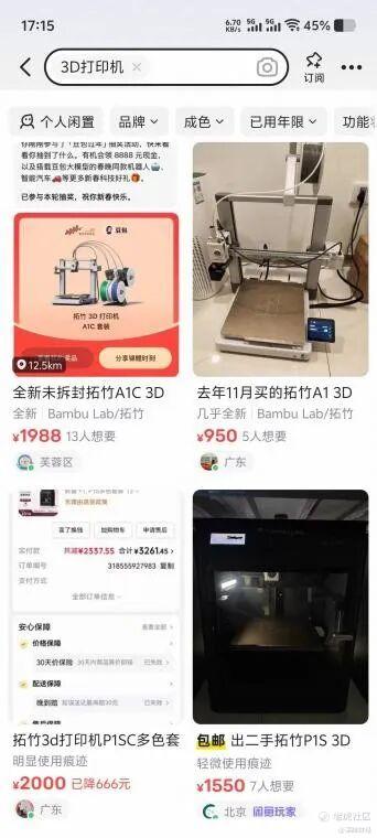 最直观的就是二手市场的数据。原价2300元左右的拓竹P1系列在闲鱼跌至1900元左右;被时代抛弃的第一代3D打印机,更是当废铁卖,售价集中在四五百元,却依然乏人问津。