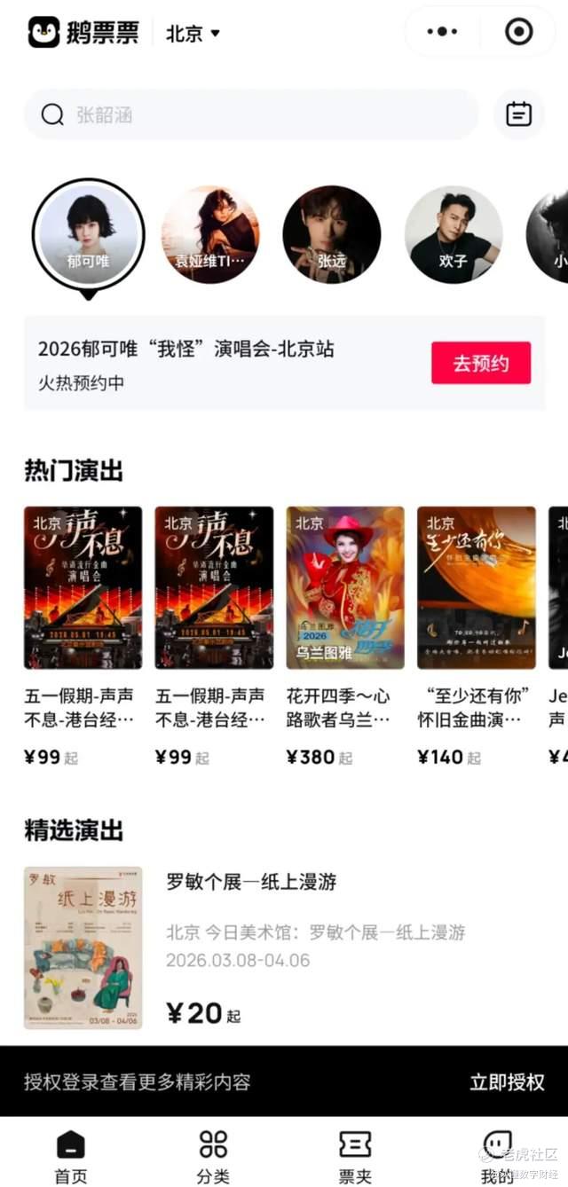 从平台界面可见,鹅票票在北京地区的各类演出内容,涵盖华语流行演唱会、怀旧金曲演出、艺术展览等多个品类。