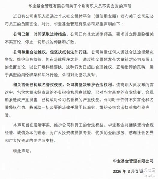 截至目前,华宝基金将胡延梅的举报定性为“大量不实指控和恶意诋毁”,已向其发送律师函,并第一时间采取法律措施。公司强调尊重合法维权,但坚决反对通过社交媒体进行“舆论绑架和法外行径”。
