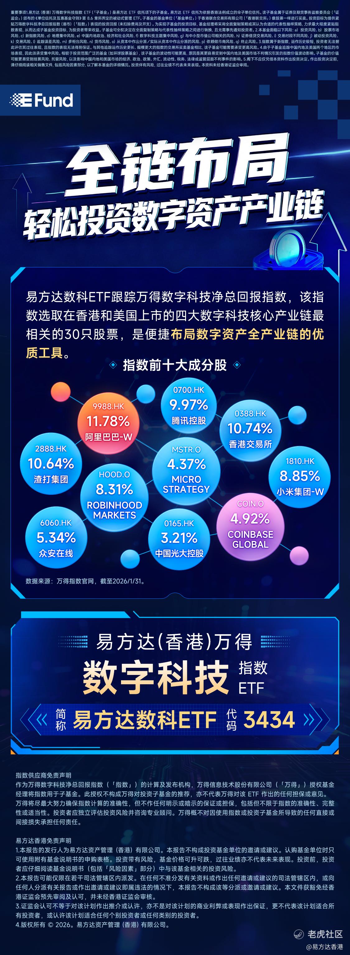 多元化配置分散风险: 单一持有策略公司波动较大,通过易方达数字科技ETF(3434) $易方达数科(03434)$ 进行配置,可同时覆盖产业链上中下游的优质公司,在把握创新趋势的同时,有效分散单一商业模式和个股风险。