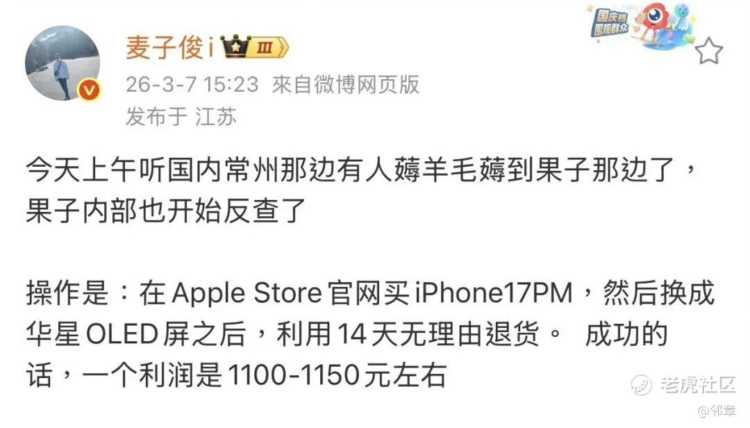 这些不法分子在用国产屏幕替换iPhone原装屏幕后,利用苹果14天无理由换货政策去退换货,进而赚取屏幕差价。