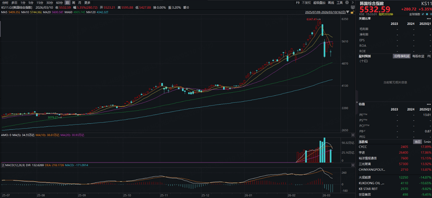 3月10日亚洲股市普遍反弹,其中韩国股市表现最为强势。KOSPI指数当日上涨约5.48%,回到5532点。