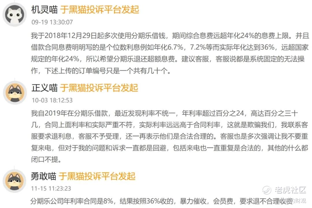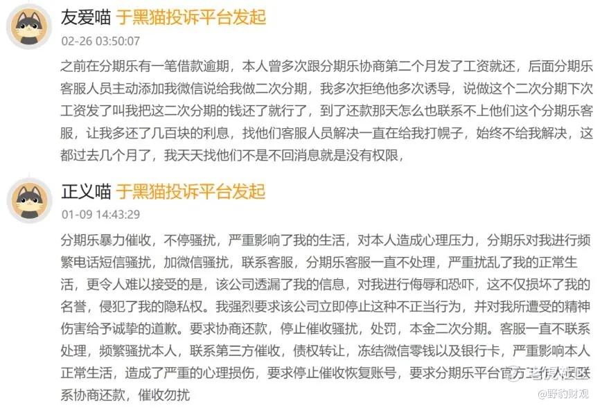 与之形成刺眼对比的,是黑猫投诉平台上超16万条针对分期乐的投诉,其中900余条与校园贷相关,2万余条直指暴力催收,更有无数用户控诉其违规收取高额息费。
