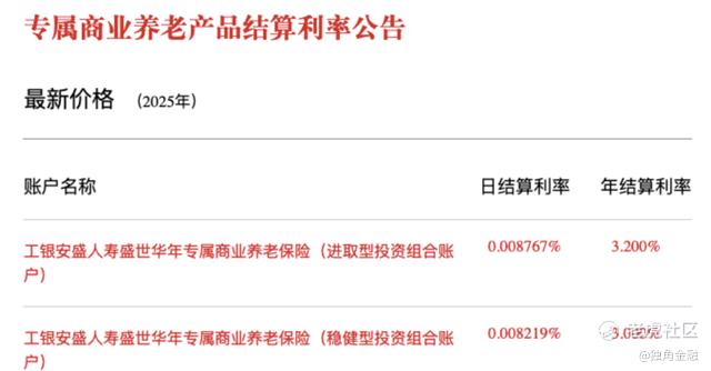 官网显示,工银安盛人寿盛世华年专属商业养老保险进取型投资组合账户日结算利率0.008767%,年结算利率3.2%;稳健型型投资组合账户日结算利率0.008219%,年结算利率3%。