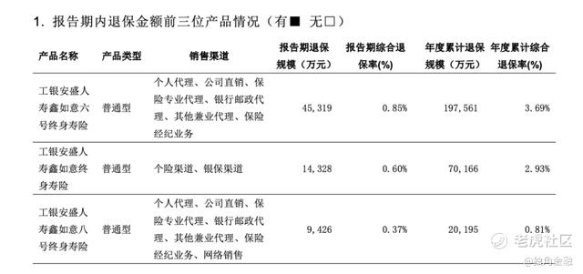 从产品退保情况来看,工银安盛人寿的退保率相对较低,年度退保率最高的是“金盛金生财智投资连结”,为16.26%。而退保金额前三的产品均为“鑫如意”系列产品,其中鑫如意六号终身寿险,年度累计退保规模为19.76亿元;鑫如意终身寿险年度累计退保规模7.02亿元;鑫如意八号终身寿险年度累计退保规模2.02亿元,合计约28.8亿元。