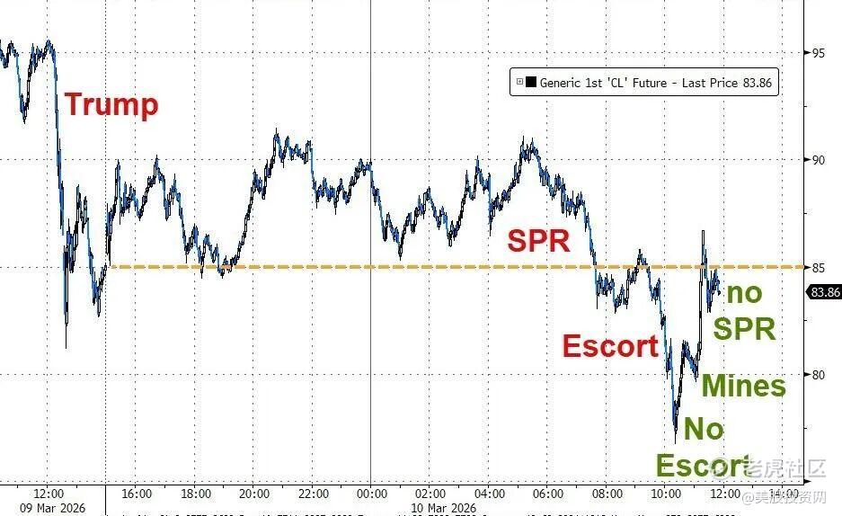 紧接着,白宫新闻秘书否认了护航一事,加上国际能源署(IEA)会议未发布释放战略石油储备的声明,油价随后迅速反弹,从76美元附近回升至86美元。