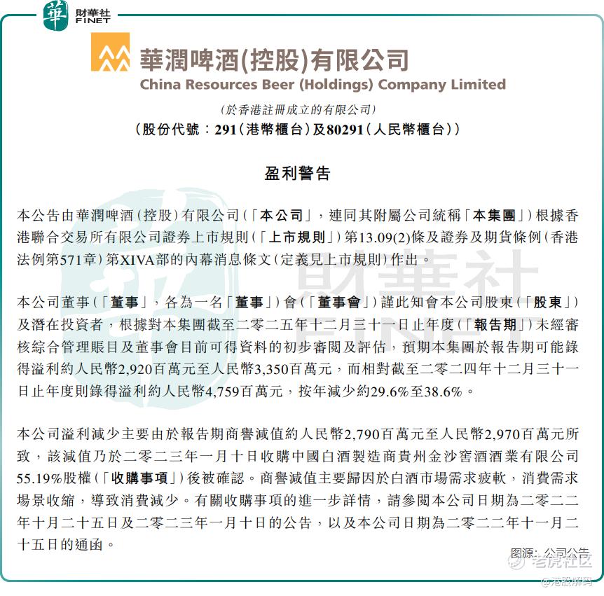 3月10日晚间,国内啤酒赛道绝对龙头 $华润啤酒(00291)$ 的一纸盈警公告,让市场捏了把汗。