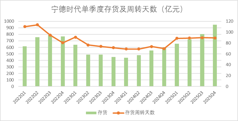 2025年四季度最新的财报显示,目前宁德时代的存货总额达到了945亿,创造了历史新高,按照管理层的说法,目前储能业务的整体解决方案实施周期较长,延缓了部分出货,当然最直接的影响是,目前宁德时代的产能利用率突破了100%,满产肯定会带来存货资产的激增。
