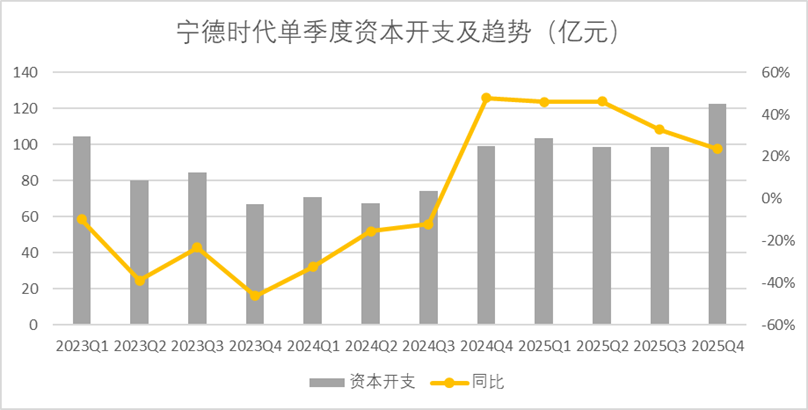 四季度,宁德时代资本开支维持在了高位,以现金流量表(购置固定资产)口径来看,录得122.6亿元,创自2023年以来的单季度新高,同比增长了23.7%。