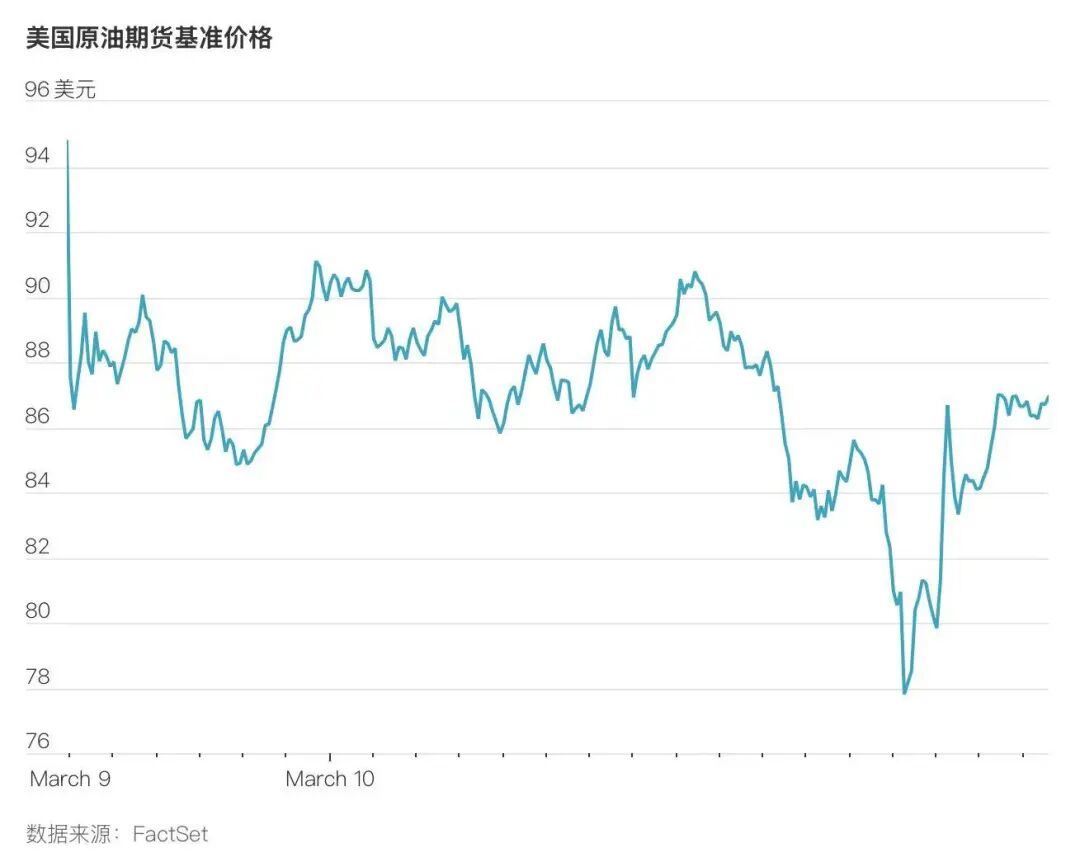 期货价格虽从低点反弹,但周二结算价仍下跌12%,至每桶83.45美元,创下四年来最大单日跌幅。盘中低点触及76.73美元,较周日晚间119.48美元的峰值暴跌36%,这是自2020年4月疫情最严重时期以来最大的两个交易日峰谷跌幅。