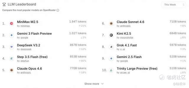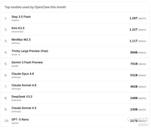 目前OpenClaw的日榜与月榜前三甲被中国大模型Step 3.5 Flash、Kimi K2.5、MiniMax M2.5包揽,“国产龙虾三剑客”格局由此形成,共同展现出中国开源模型的强劲竞争力。不局限于OpenClaw单一APP,Step 3.5 Flash在OpenRouter统计的全球大模型调用量中增速同样明显,过去7天调用量达853B tokens,环比增速90%,与MiniMax M2.5、DeepSeek V3.2一起位居全球前五。