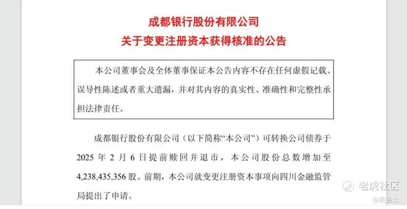 3月7日,成都银行发布公告称,已收到四川金融监管局《关于成都银行变更注册资本的批复》,获准将注册资本由 37.36 亿元增至 42.38 亿元,增幅达 13.46%,成为 2026 年国内首家获批通过可转债转股实现增资的银行。