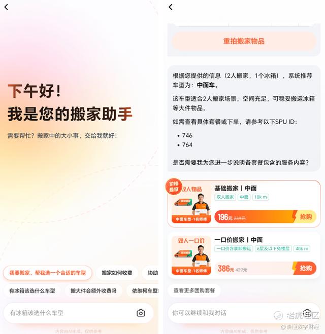 经初步体验,该AI助手一方面可以承载AI客服功能,另一方面其最醒目的对话提示是“我要搬家,帮我选一个合适的车型”,如用户点击此项即可描述进一步描述搬家需求,AI会提供车型和套餐、下单建议。