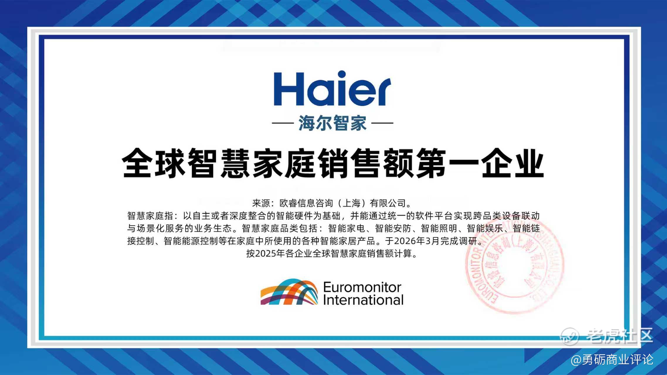 欧睿国际最新数据显示:继家电全球17连冠后,海尔智家又成为全球智慧家庭销售额第一企业。截至2025年底,海尔智慧家庭全球累计注册用户突破1.3亿,全年智慧场景交互总量达861亿次,月均交互71.75亿次。在国内及一带一路沿线国家,Hai Smart生态平台拥有1300多万活跃用户、6600多家生态合作方、5500多万台联网设备;在美洲、欧洲、澳洲地区,SmartHQ平台汇聚460多万活跃用户、6500多家生态合作方、2100多万台联网产品。