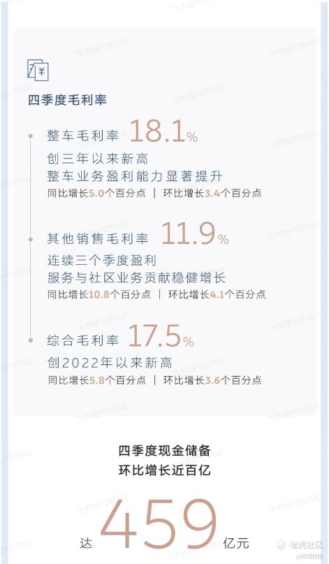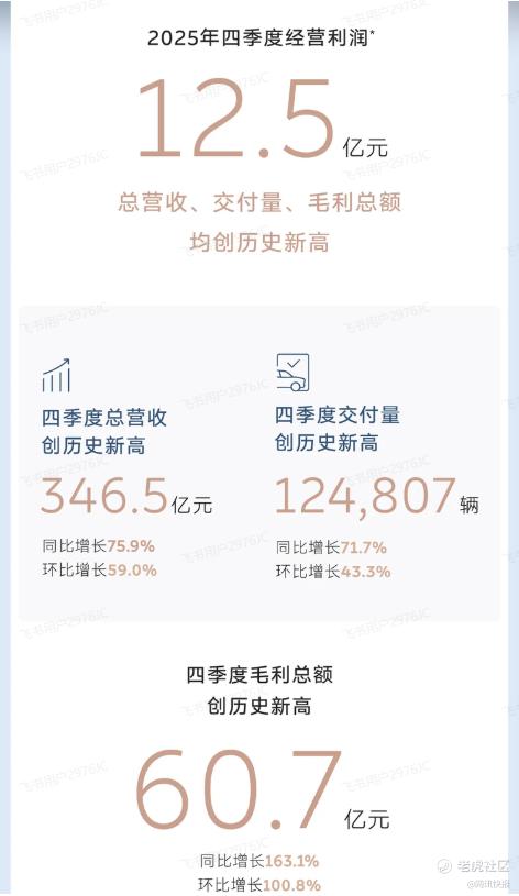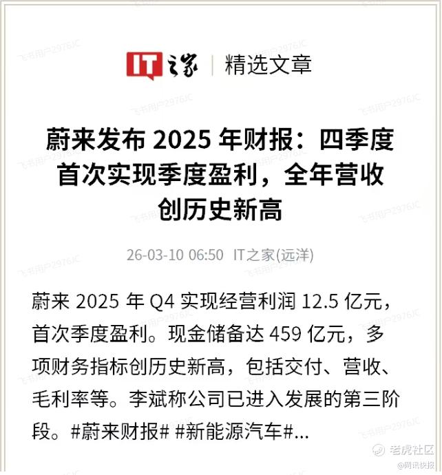 近日,蔚来正式发布2025年第四季度财务报告,这份承载着行业期待的财报,交出了成立十一年来的首个单季度盈利答卷,标志着这家曾被质疑的车企,正式跨过盈亏平衡线,迈入高质量增长的全新阶段。财报核心数据显示,蔚来Q4经调整经营利润(non-GAAP)达12.5亿元,财报显示,Q4总营收、交付量、毛利总额均创历史新高,综合毛利率创2022年以来新高,现金储备459亿左右,环比增长近百亿,直接肯定了这份盈利答卷的含金量。