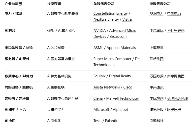 第一层:能源,没有电力就没有AI,像核电、电网、电力公司这些可能会有投资机会;