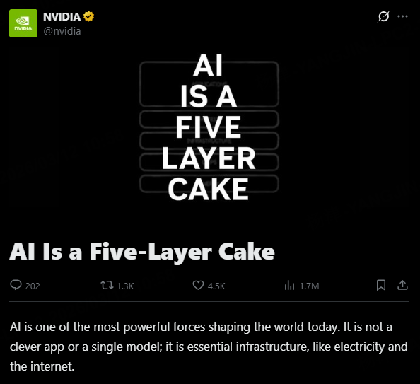 黄仁勋罕见发了篇长文《AI的五层蛋糕》,再次重申了之前的观点:AI基础设施正在形成一个完整闭环,每一层都会推动下一层增长。那具体说了哪几层?[正经]